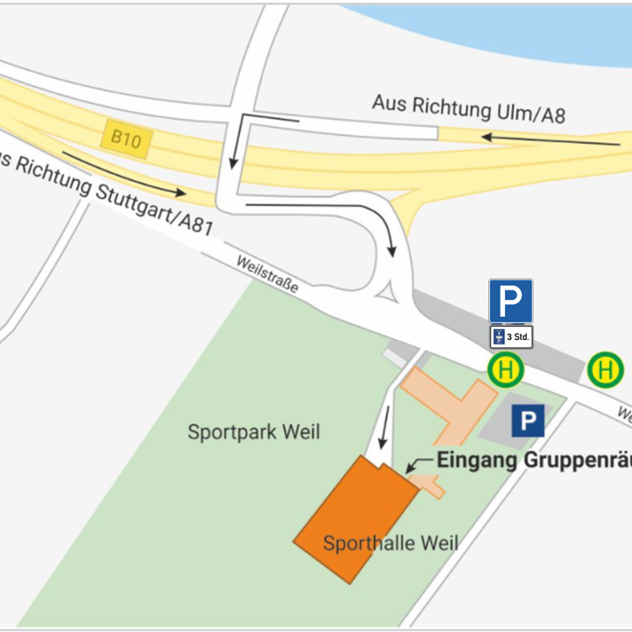 Auf den Parkplätzen hinter der Bushaltestelle „Sportpark Weil“ stehen Ihnen insgesamt 47 Parkplätze, darunter 3 Parkplätze für Menschen mit Behinderung zur Verfügung.